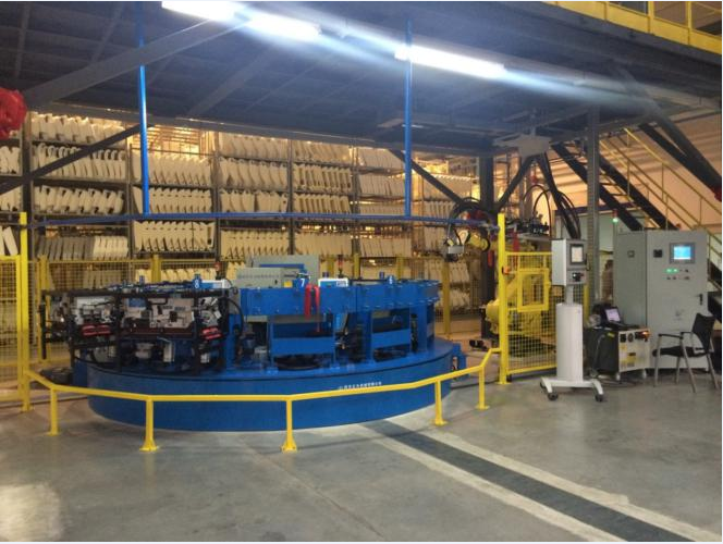 全自動環形發泡生產線是專門為大規模汽車坐墊發泡而設計的,該生產線為地面環形結構,最多可設60工位,生產節拍自動調節,系統采用機器人自動澆注,能實現雙硬度汽車坐墊和靠墊的混線生產,具有自動化程度高、性能安全可靠、適合大批量生產等特點。